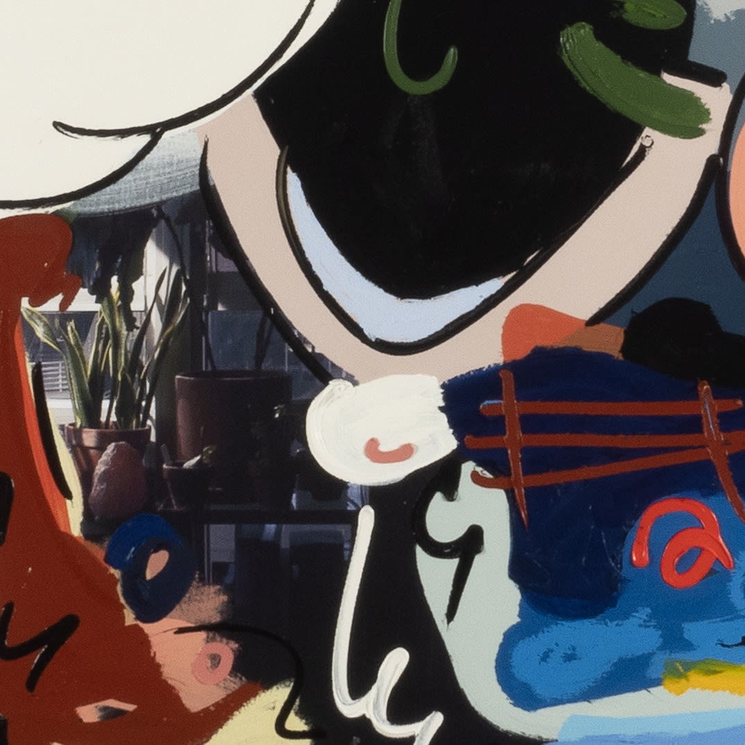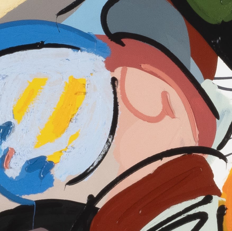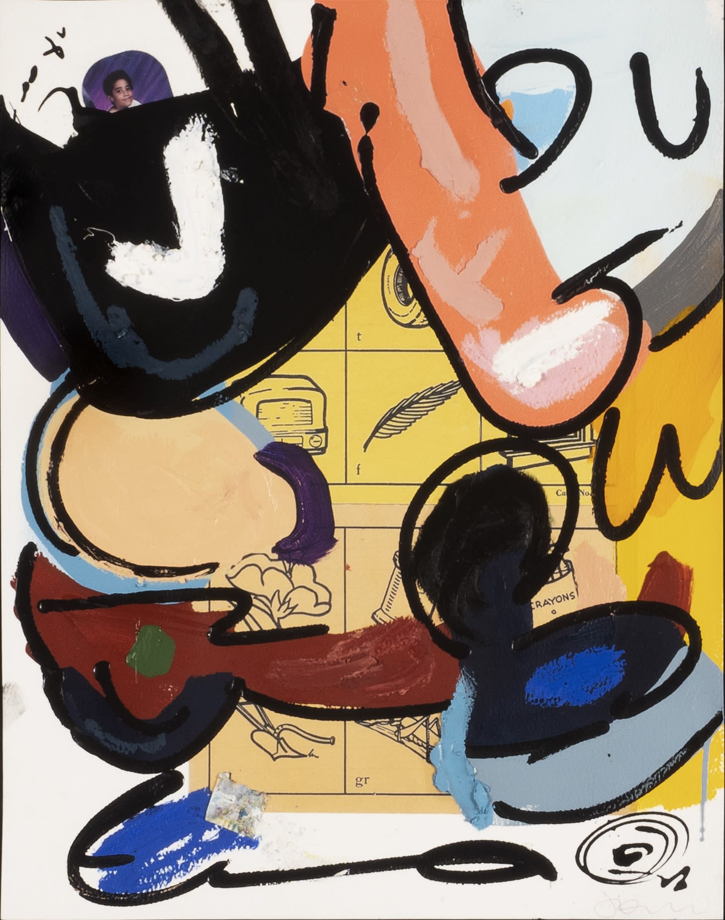 Oil stick, oil, acrylic, enamel, airbrush on canvas sewn to fabric