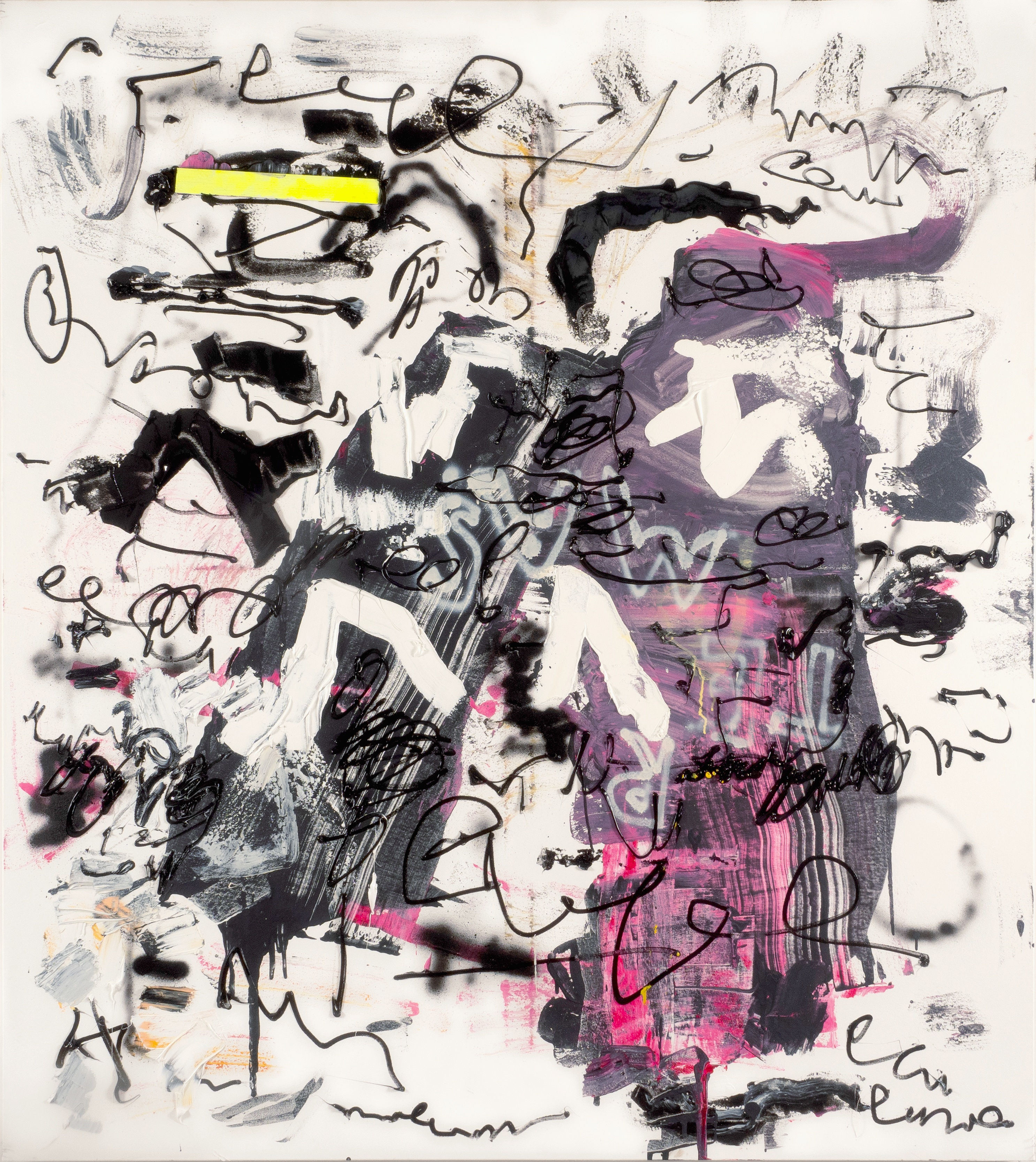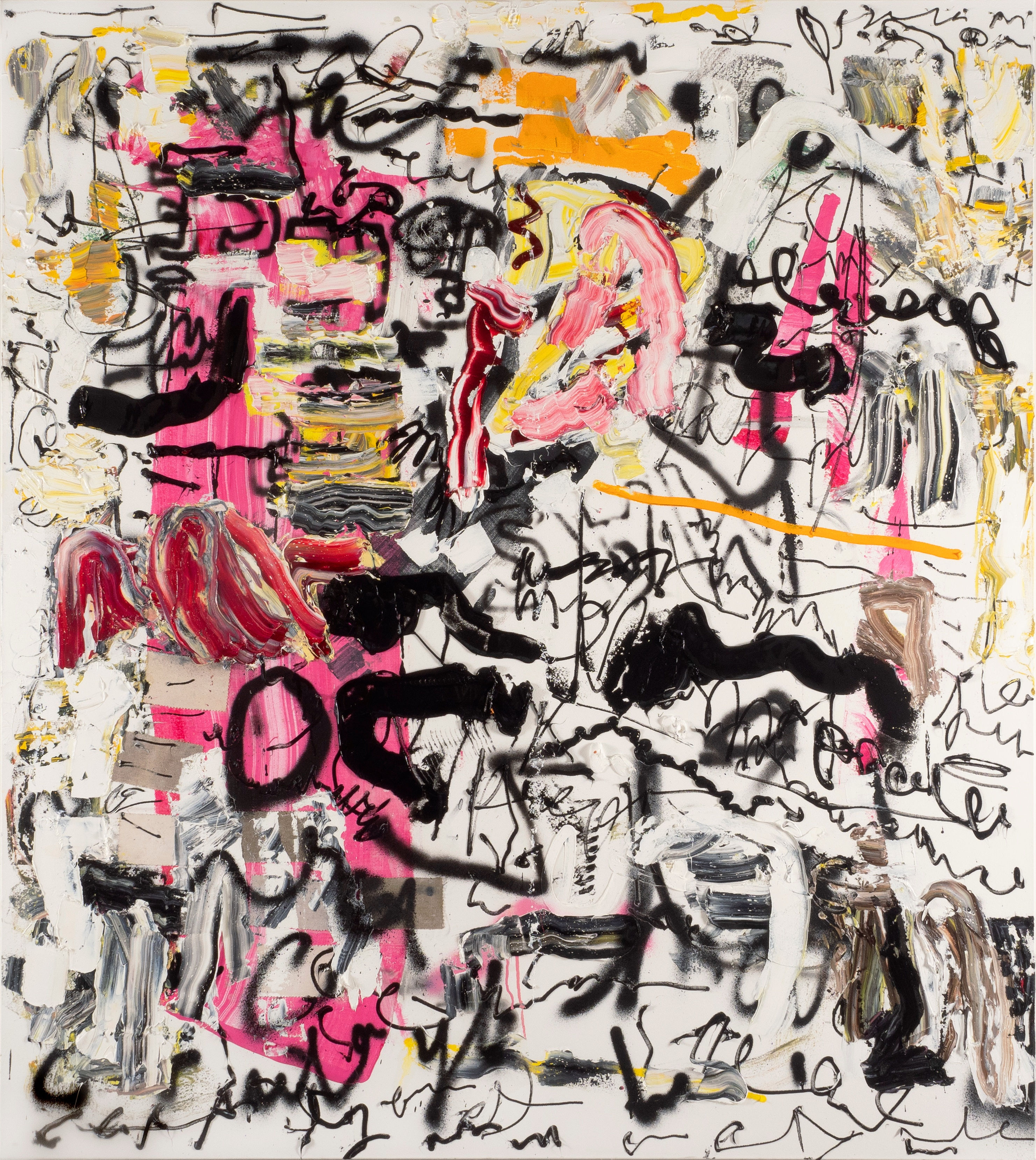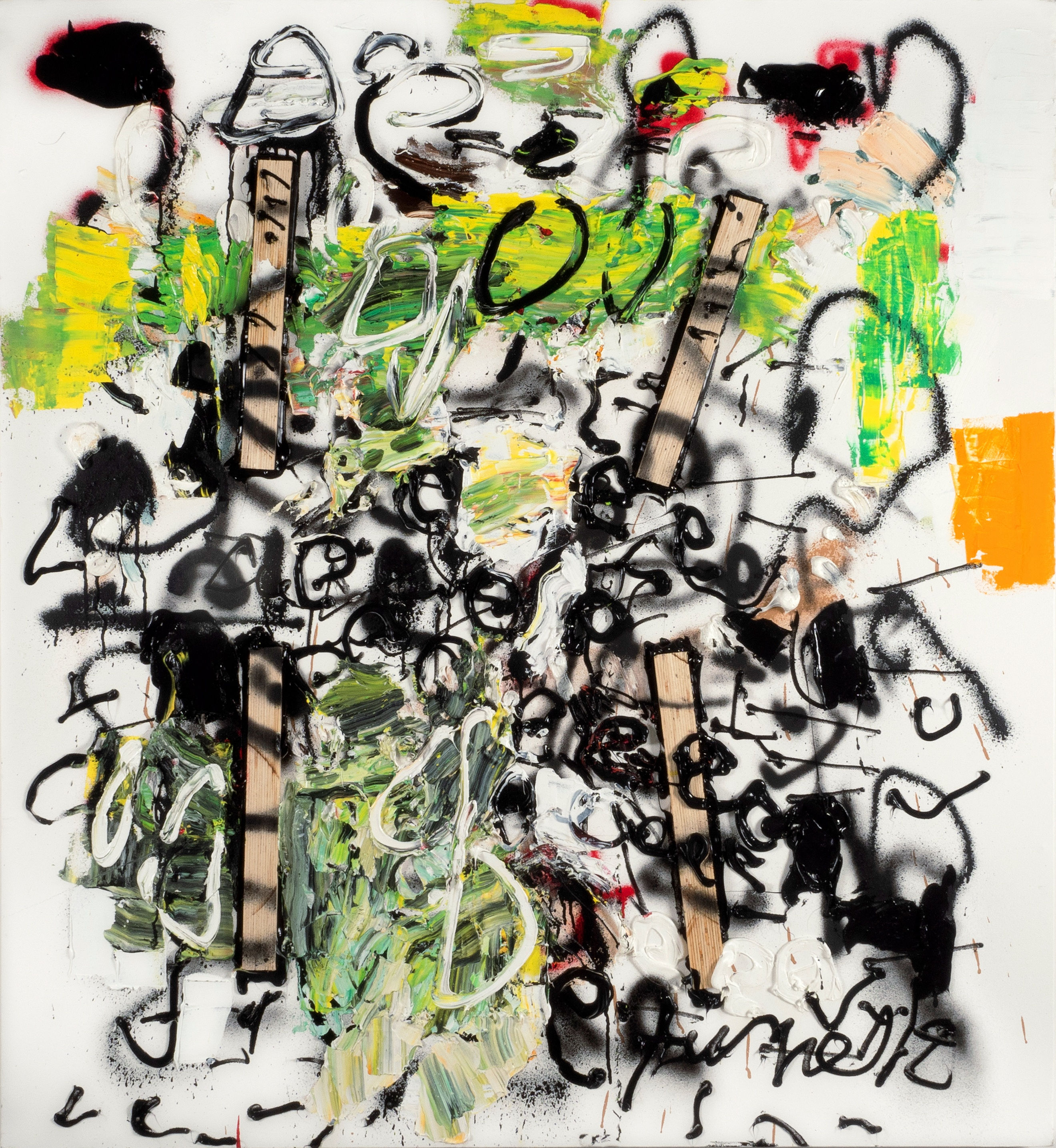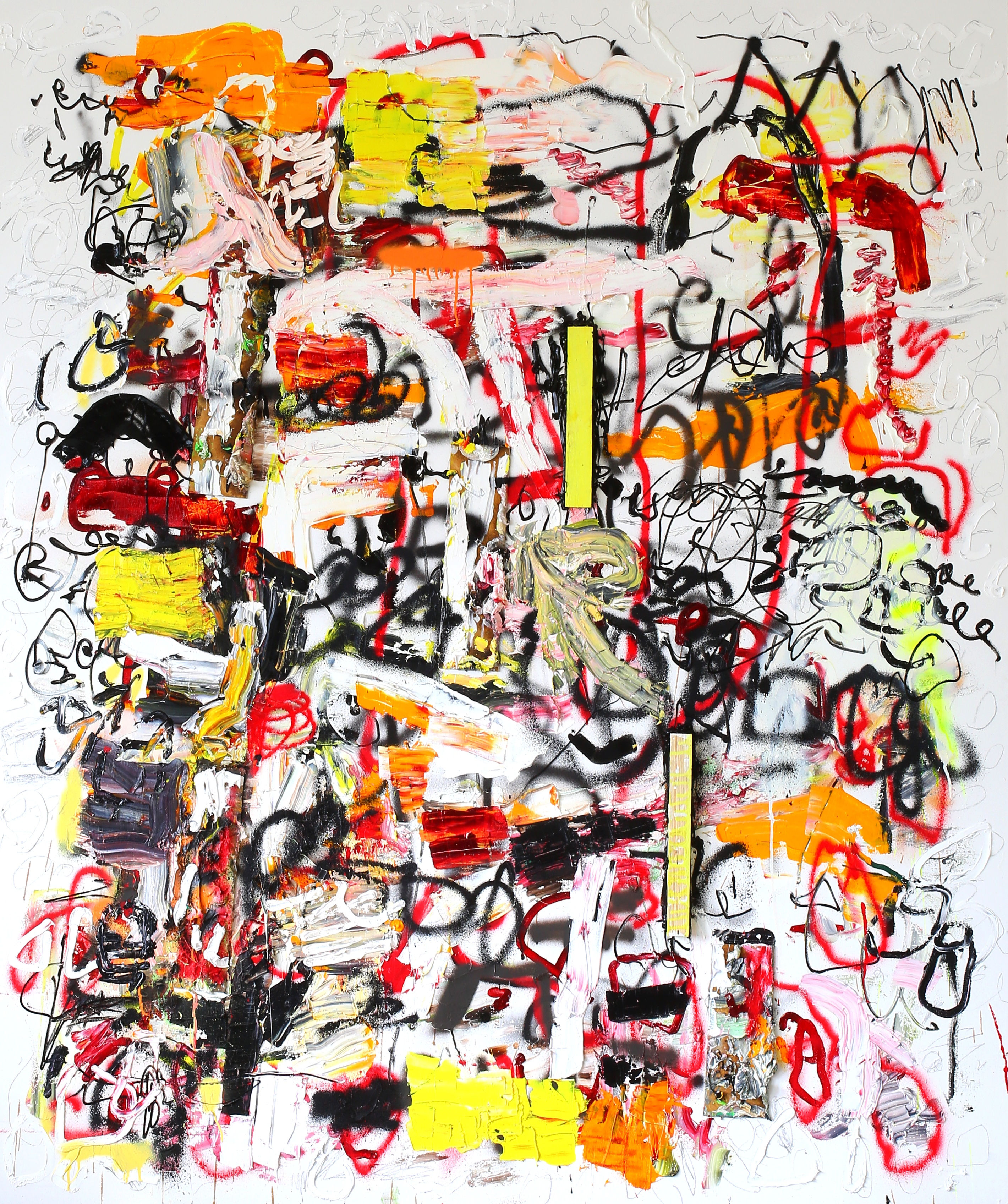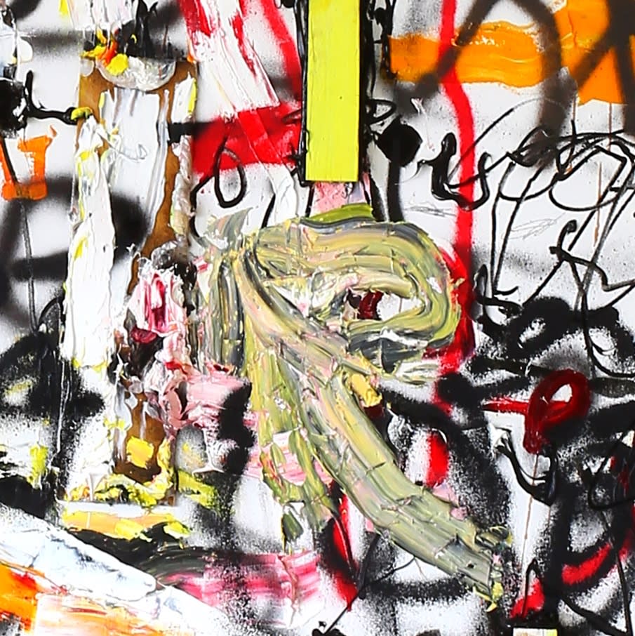 Acrylic, silicone, spray, collage, wood and oil on canvas