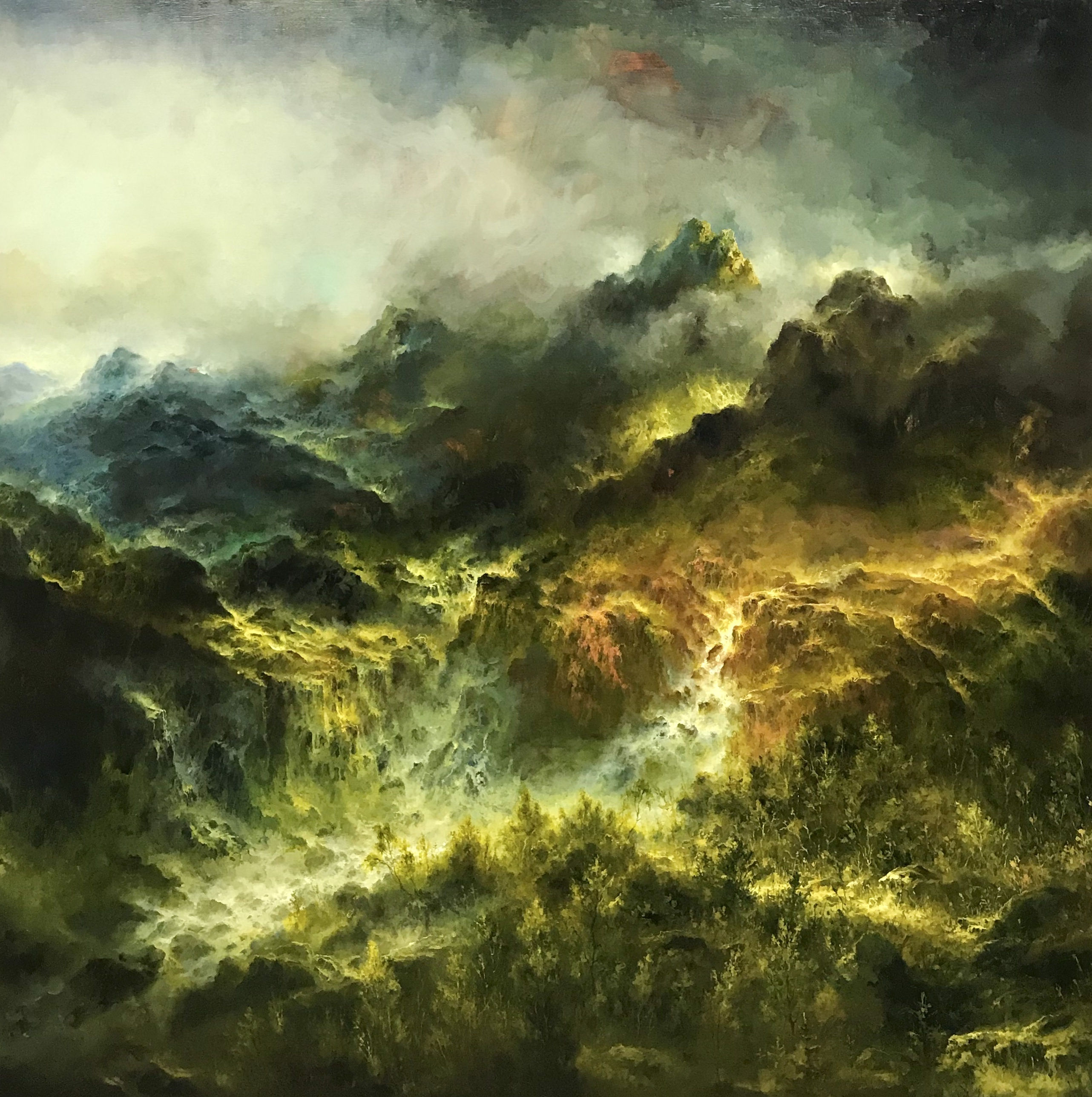 First we are introducing Petri Ala-Maunus, whose paintings are landscape simulations in the sense intended by Jean Baudrillard, copies without an original. They are nameless places that seem to exist thousands of years from the present moment, but in which direction? The creation story and the end of the world shake hands.