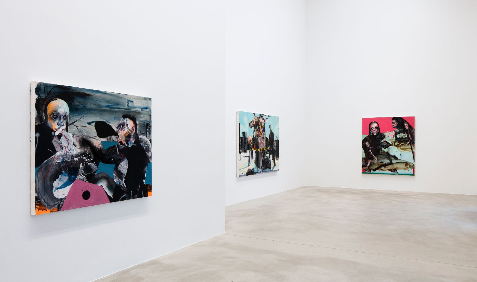 Viljami Heinonen's (b.1986) dramatic works are filled with explicit violence and the threat of violence, desperation and situations of conflict. His works are kinds of painted collages, still images whose lushly tattered exteriors make them appear in places as if the fiercest battles had been fought out on their surface. His visual language and treatment of motifs contain numerous links with both the punk aesthetic and the tradition of post-war Informalism and Neorealism.